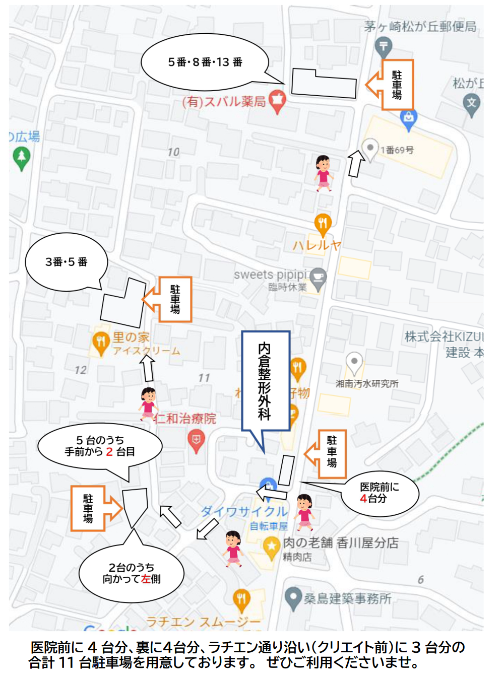 茅ヶ崎の国道1号線・134号線・鉄砲通り・桜道より ラチエン通り入っていただくと、通り沿いにあります。 わからないときは、お気軽にお電話(0467-84-0070)ください。 ※駐車場あり(医院前4台、他7台) |