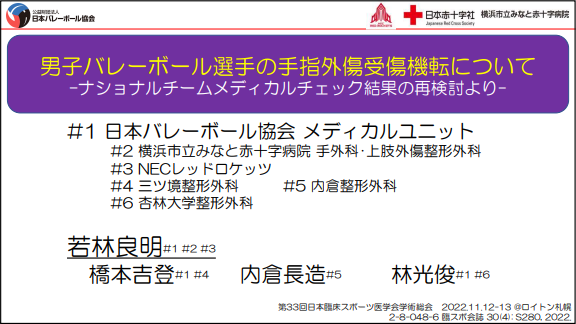 2022年11月 第33回 日本臨床スポーツ医学会学術総会で当院院長も携わったバレーボール選手の手指外傷について、横浜市立みなと赤十字病院の整形外科部長、若林良明先生の発表がありました。 |